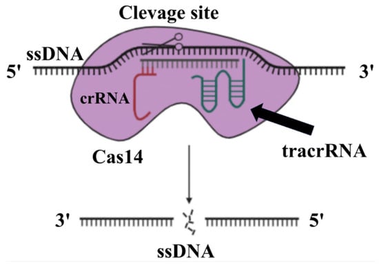 Representation of targeting and cleavage principles in CRISPR/Cas14 System. The Cas14 protein consists of both tracrRNA and crRNA, enabling it to target ssDNA. It recognizes single-stranded DNA with the assistance of tracrRNA and crRNA, mediates interaction with the target ssDNA through the seed sequence, and efficiently cleaves ssDNA while showing no activity against dsDNA or ssRNA. Unlike Cas9, Cas12, and Cas13 proteins, Cas14’s cleavage efficiency is more specific and does not require the presence of a PAM region.