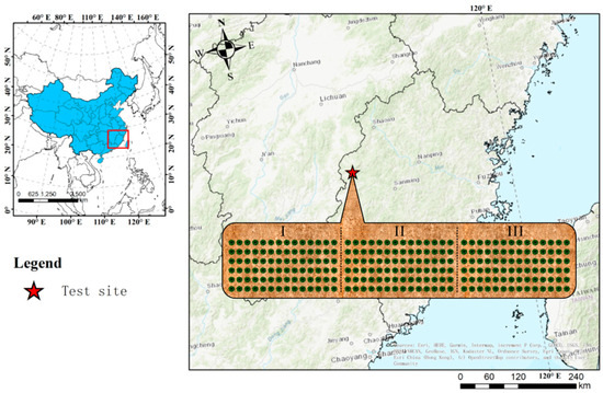 The research site was situated in Jianning County, Fujian Province, specifically at coordinates 116°47′20″ E and 26°40′3″ N. It experiences an average annual temperature of 17.0 °C, an average annual rainfall amounting to 1792 mm, and a high relative humidity of 84%. The soil type at the test site was sandy clay loam. The nutrient status of the soil in this experimental area was 7.75 g·kg−1 of soil organic carbon, 1.40 g·kg−1 of total nitrogen, 0.36 g·kg−1 of total phosphorus, 27.95 g·kg−1 of total potassium, 48.16 mg·kg−1 of fast-acting potassium, 1.32 mg·kg−1 of effective phosphorus, and 36.01 mg·kg−1 of alkaline dissolved nitrogen [8,9]. The raw material forest comprises the “Yuanhua” asexual line of Sapindales trees, featuring an average tree height of 2.38 m, an average ground diameter of 6.97 cm, and an average crown width of 2.4 m × 2.2 m (Figure 1).