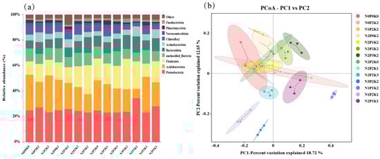 Relative abundance of horizontal species of soil bacteria under different fertilization treatments. (a) Relative abundance of portal bacterial level species. (b) Bacterial OTU horizontal principal component analysis.