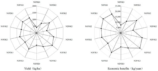Effects of various fertilization treatments with nitrogen, phosphorus, and potassium on Sapindus mukorossi yield and financial gains (Figure 3). The yield can be significantly increased by fertilization, which also enhances the financial gains. While the yield of nutrient deficiency treatment was significantly higher than that of total nutrient treatment and significantly lower than that of fertilization treatment, N2P2K2 was the highest yield compared to both fertilization and nutrient deficiency treatments. The yield of low, medium, and high nitrogen fertilizer treatments improved by 51%, 85%, and 61%, respectively, at different levels of nitrogen addition, while the economic revenue increased by 7275, 12,150, and 8700 yuan/hm2. At different levels of alkaline addition, compared with no phosphate fertilizer, the low, medium, and high phosphate fertilizer treatments increased the yield by 67%, 85%, and 45% and increased the economic income by 9376, 12,150, and 6362 yuan/hm2. At different levels of phosphate addition, the low, medium, and high phosphate fertilizer treatments raised the yield by 67%, 85%, and 45% and the economic revenue by 9376, 12,150, and 6362 yuan/hm2, respectively, in comparison to no phosphate fertilizer. When low, medium, and high potassium fertilizers were applied at different levels of alkaline addition, the yield and economic income increased by 45%, 85%, and 20%, respectively, and by 7275, 12,150, and 3263 yuan/hm2, in comparison to no potassium fertilizer. Balanced application of nitrogen, phosphorus, and potassium fertilizer significantly impacts yield formation.