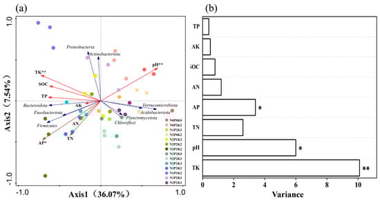 Biplot of the RDA analysis of soil bacterial communities under different fertilization treatments. (a) RDA analysis of bacterial communities. (b) Soil environmental factor parameter variables. Note: * is significant at the 0.05 level and ** is significant at the 0.01 level.