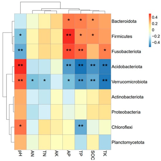 By correlating the relative abundance of the dominant phyla with soil environmental factors (Figure 5), it could be learned that Fusobacteriota and Firmicutes were all significantly negatively correlated with soil pH (p < 0.05), whereas there was a significant positive correlation (p < 0.05) with the contents of total phosphorus and available phosphorus (p < 0.05). Among them, Firmicutes and Bacteroidota were also significantly (p < 0.05) positively correlated with organic carbon content. Both Acidobacteriota and Verrucomicrobiota were significantly (p < 0.05) negatively correlated with total phosphorus, total potassium, available phosphorus, and organic carbon content. In addition, both Acidobacteriota and Chloroflexi showed a statistically significant positive correlation with soil pH (p < 0.05).