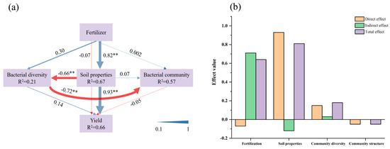(a) Direct and indirect effects of fertilizer, soil properties, and bacterial attributes on the Sapindus mukorossi yield. (b) Overall effects of fertilization, Sapindus mukorossi soil properties, community diversity, and structure on yield. Note: Soil properties refer to total nitrogen, available nitrogen, total phosphorus, available phosphorus, total potassium, quick-acting potassium, organic carbon content, and pH; bacterial diversity is OTU richness, Shannon index, and Simpson index; and community structure is the first two axes of principal components (PC1 and PC2). The numbers on the arrows are standardized path coefficients, with blue arrows indicating positive effects and red arrows indicating negative effects. Path coefficients and coefficients of determination (R2) were derived after 999 bootstrapping attempts. R2 values indicate the variance explained by the model. The model was evaluated using the goodness-of-fit statistic, which is a measure of overall predictive performance. Significance is indicated by different path coefficients, ** p < 0.01.