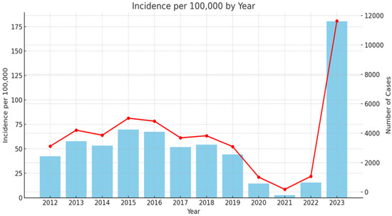 Epidemiology rate of scarlet fever in Bulgaria 2012–2023. Red line—incidence of scarlet fever cases per 100,000 inhabitants per year (left y-axis). Blue columns—number of scarlet fever cases per year (right y-axis).