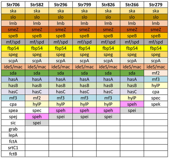 Virulence factor genes identified in the seven Streptococcus pyogenes genomes. Strain names are listed in the first row, in columns are listed detected virulence genes. The strain Str 706 was found to belong to the M1UK lineage.