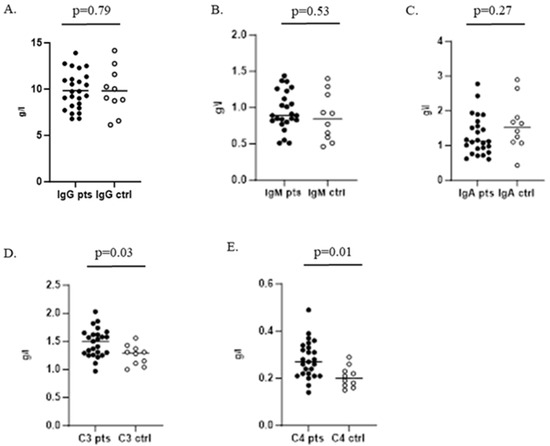Total serum immunoglobulins G, M, and A (IgM, IgM, IgA), as well as C3 and C4 complement levels, were measured by appropriate reagent kits (Abbott, Chicago, IL, USA), performed on Alinity automated analyzer (Abbott, Chicago, IL, USA).