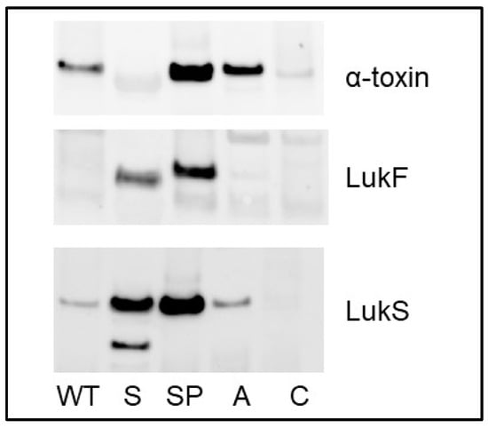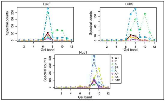 Additionally,, we previously concluded that LukF is only present in a truncated form in CM from the sarA mutant and that this might be a limiting factor in the activity of the bi-component Panton–Valentine leukocidin (PVL) [20]. Here, we confirmed the presence of this truncated product and the fact that it was absent in CM from the protease-deficient sarA mutant, but also detected a larger version of LukF that was not apparent by Western blot (Figure 1). This size of this protein was similar to full-length LukF, but it was nevertheless truncated as evidenced by the loss of an antibody-binding site [20]. Thus, this does not contradict the suggestion that the absence of full-length LukF may be a limiting factor in the phenotypic impact of PVL, but it does further illustrate the utility of our mass-based approach. This did not appear to be a concern with LukS and Nuc1 in that both full-length and truncated versions of these proteins were detected by both Western blot and in our proteomics analysis (Figure 1).