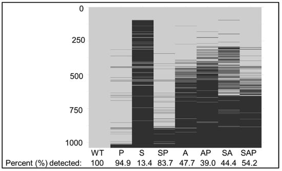 Heatmap reflecting the detection of proteins in LAC and its regulatory mutants as a function of protease production. CM from overnight cultures of LAC, isogenic derivatives with mutations in sarA (S), agr (A), sarA/agr (SA), and protease deficient derivatives of all these strains (P, SP, AP, and SAP, respectively). 1039 proteins were detected in CM from LAC. Horizontal black lines in each column indicate proteins that were absent in CM from each mutant, with the percentage of the 1039 proteins detected in CM from LAC that were detected in CM from each mutant indicated.
