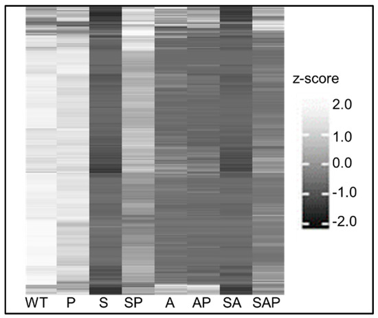 Heatmap reflecting strain dependent variation of prioritized S. aureus proteins. Average spectral counts from 5 biological replicates were determined for LAC (WT), isogenic derivatives with mutations in sarA (S), agr (A), sarA/agr (SA), and protease deficient derivatives of all these strains (P, SP, AP, and SAP, respectively). The relative abundance of the 224 proteins that were found to be present in limited amounts in sarA and sarA/agr mutants owing to protease mediated degradation are shown after transforming data to the Z-scale to reflect the relative differences of each protein to the same protein in all other samples.