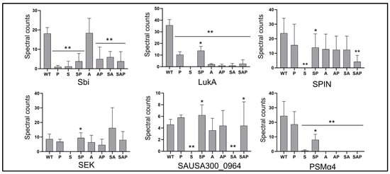 Targeted proteomic comparisons. The abundance of full-length versions of each of the six proteins identified by Gimza et al. [13] was determined using CM from LAC (WT), isogenic derivatives with mutations in sarA (S), agr (A), sarA/agr (SA), and protease deficient derivatives of all of these strains (P, SP, AP, and SAP, respectively). Double asterisks indicate a statistically significant reduction in spectral counts by comparison to CM from LAC as determined by one-way ANOVA. Single asterisks indicate a statistically significant increase in CM from protease deficient derivative of each strain by comparison to its isogenic regulatory mutant as determined by t-test.