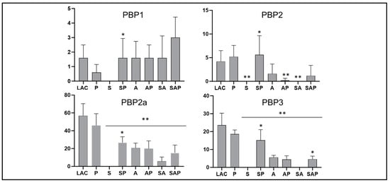 Targeted proteomic analysis of penicillin binding proteins (PBPs). The abundance of full-length PBPs was determined using CM from LAC (WT), its sarA (S), agr (A), and sarA/agr (SA) mutants, and protease deficient derivatives of all 4 strains. Double asterisks indicate a statistically significant reduction in spectral counts as determined by one-way ANOVA comparisons to CM from LAC. Single asterisk indicates a significant increase in the protease-deficient derivative by comparison to its isogenic regulatory mutant as determined by t-test.