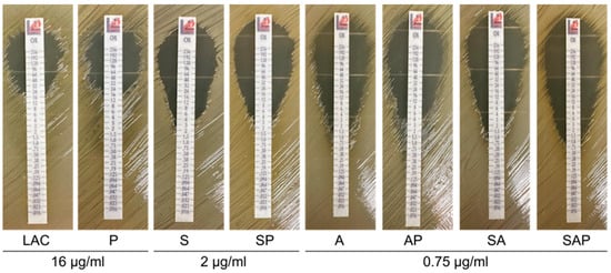 Impact of sarA, agr, and extracellular proteases on oxacillin susceptibility. Susceptibility was assessed by E-strip for LAC, isogenic sarA (S), agr (A), and sarA/agr (SA) mutants, and protease-deficient derivatives of all strains (P, SP, AP, and SAP, respectively). The approximate minimum inhibitory concentration shown below the figure was not affected by protease production in any strain.