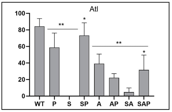 Proteomic comparison for autolysin (Atl). The abundance of full-length Atl was determined using CM from LAC (WT), its sarA (S), agr (A), and sarA/agr (SA) mutants, and protease-deficient derivatives of all four strains. Double asterisks indicate a statistically significant reduction in spectral counts as determined by one-way ANOVA comparisons to CM from LAC. Single asterisk indicates a significant increase in each protease-deficient strain by comparison to its isogenic regulatory mutant as determined by t-test.