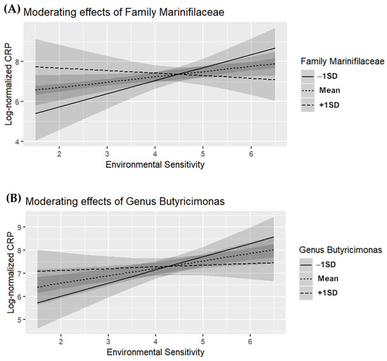 For individuals with high environmental sensitivity, there was no significant association with CRP when family Marinifilaceae abundance was high (M + 1SD; β = −0.110, p = 0.496). However, CRP levels were significantly elevated when the abundance of family Marinifilaceae was low (M − 1SD; β = 0.434, p = 0.008) (Figure 1A). Similar results were observed for other taxa. When genus Butyricimonas abundance was high (M + 1SD; β = −0.020, p = 0.855), no significant association with CRP was found, but when its abundance was low (M − 1SD; β = 0.392, p = 0.003), CRP levels were significantly higher (Figure 1B).