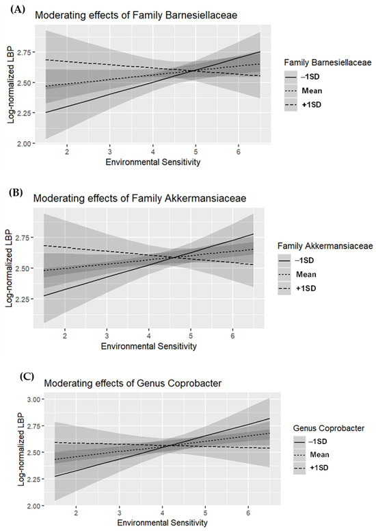 For LBP, individuals with high environmental sensitivity showed no association when family Barnesiellaceae was abundant (M + 1SD; β = −0.127, p = 0.419), but LBP levels were significantly elevated when the abundance of family Barnesiellaceae was low (M − 1SD; β = 0.371, p = 0.011) (Figure 2A). Similarly, in individuals with high environmental sensitivity, no association with LBP was found when family Akkermansiaceae abundance was high (M + 1SD; β = −0.143, p = 0.386), but LBP levels were elevated when its abundance was low (M − 1SD; β = 0.362, p = 0.015) (Figure 2B). Individuals with high environmental sensitivity showed no association with LBP when genus Coprobacter abundance was high (M + 1SD; β = −0.077, p = 0.560), but LBP levels were significantly higher when its abundance was low (M − 1SD; β = 0.402, p = 0.009) (Figure 2C). Similarly, individuals with high environmental sensitivity showed no association with LBP when genus Akkermansia abundance was high (M + 1SD; β = −0.143, p = 0.386), but LBP was elevated when genus Akkermansia abundance was low (M − 1SD; β = 0.362, p = 0.015) (Figure 2D). Individuals with high environmental sensitivity showed no association with LBP when genus Family XIII AD3011 group abundance was high (M + 1SD; β = −0.126, p = 0.376), but LBP was elevated when genus Family XIII AD3011 group abundance was low (M − 1SD; β = 0.393, p = 0.004) (Figure 2E). Similarly, individuals with high environmental sensitivity showed no association with LBP when genus GCA-900066225 abundance was high (M + 1SD; β = −0.238, p = 0.218), but LBP was elevated when genus GCA-900066225 abundance was low (M − 1SD; β = 0.420, p = 0.006) (Figure 2F). Individuals with high environmental sensitivity showed no association with LBP when genus Ruminiclostridium 1 abundance was high (M + 1SD; β = −0.140, p = 0.396), but LBP was elevated when genus Ruminiclostridium 1 abundance was low (M − 1SD; β = 0.370, p = 0.015) (Figure 2G).