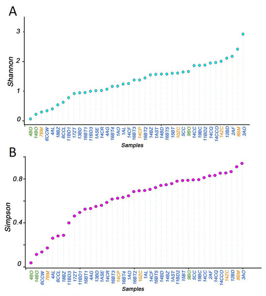 Intestinal bacteria diversity for 20 species of tephritidae. (A) Shannon index. (B) Simpson index. Monophagy (green), oligophagy (orange), and polyphagy (blue). BO: Bactrocera oleae; BM: Bactrocera minax; CP: Ceratitis podocarpi; ZC: Zeugodacus cucurbitae; ASE: Anastrepha serpentine; AST: Anastrepha striata; AL: Anastrepha ludens; AO: Anastrepha obliqua; AF: Anastrepha fraterculus; AG: Anastrepha grandis; ZT: Zeugodacus tau; BZ: Bactrocera zonata; BC: Bactrocera carambolae; BT: Bactrocera tryoni; CC, CCW, and CCL: Ceratitis capitata; CCO: Ceratitis cosyra; CQ: Ceratitis quilicii; CR: Ceratitis rosa; CF: Ceratitis flexuosa; BD: Bactrocera dorsalis.