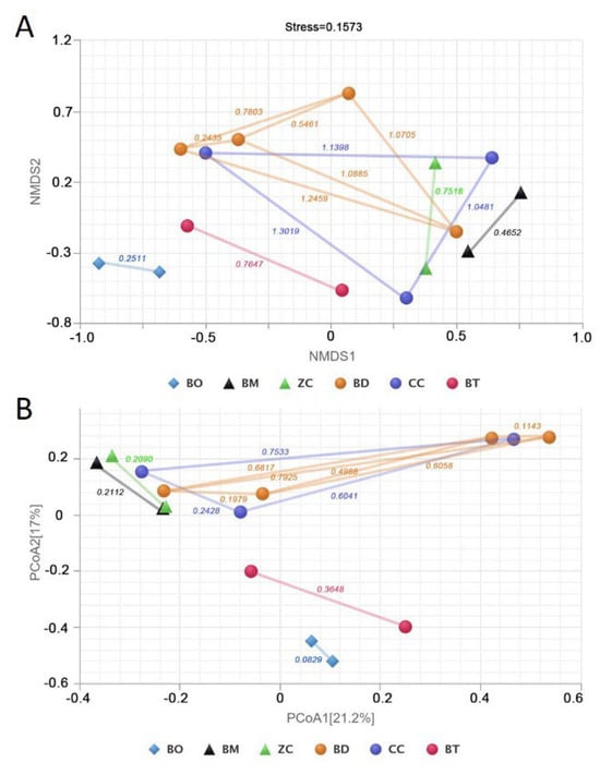 β diversity analysis of bacteria community. (A) NMDS analysis. (B) PCoA analysis. BO: Bactrocera oleae; BM: Bactrocera minax; ZC: Zeugodacus cucurbitae; BD: Bactrocera dorsalis; CC: Ceratitis capitata; BT: Bactrocera tryoni.