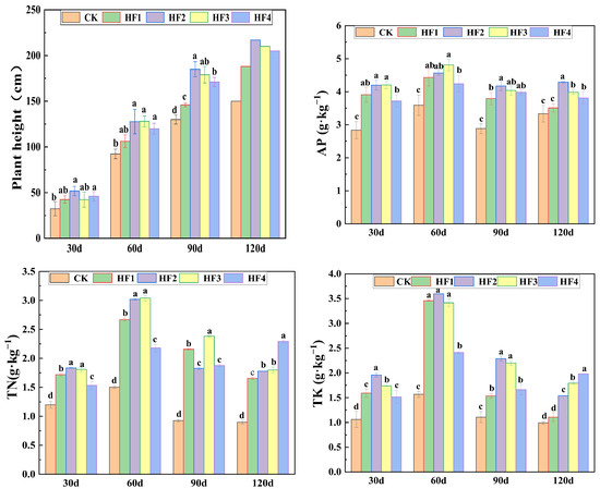 The results of nutrient determination(Figure 1) revealed that different substitution ratios of biogas slurry exerted significant influences on the nitrogen, phosphorus, and potassium contents in stems and leaves (p < 0.05). The nitrogen content accumulated during the early growth stage of corn and peaked at 60 days. At this moment, the total nitrogen contents in the HF2 and HF3 treatments were the highest, followed by the HF1 treatment and the HF4 treatment. At the harvest stage (120 days), the higher the application amount of biogas slurry, the higher the nitrogen content, with the HF4 treatment increasing the total nitrogen content by 38.79% compared to the HF1 treatment. Regarding the phosphorus content, the HF2 and HF3 treatments were relatively higher at 30 days, and at the harvest stage, the phosphorus content in the HF2 treatment was significantly higher than that in other treatments. For the potassium content, it accumulated after emergence and reached its peak at 60 days. The total potassium contents in the HF1, HF2, and HF3 treatments were the highest at this stage, and at the harvest stage, the HF4 treatment increased the total potassium content by 78.39% compared to the HF1 treatment.