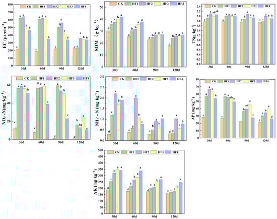 In Figure 2, the changes in soil nutrient content in different periods are presented. Different proportions of biogas slurry substituting for chemical fertilizer had a significant impact on soil electrical conductivity (p < 0.05). For example, in the harvest period (120 days), the soil electrical conductivity of the HF2 treatment reached 421.5 μs·cm−1, which was 87.33% higher than that of CK (225 μs·cm−1). As corn grew, the soil electrical conductivity gradually decreased, and the differences among treatments gradually reduced. During the growth period of corn, the content of soil organic matter decreased. The treatments with biogas slurry application were higher than those with pure chemical fertilizer treatment. At the harvest period, each fertilization treatment increased by 7.89–20.53% compared with CK. HF3 and HF4 had better improvement effects. The content of soil total nitrogen was affected by the combined application of biogas slurry. In the harvest period, HF4 > HF1 > CK, and the highest content of HF2 was 1.81 g·kg−1. The content of soil ammonium nitrogen decreased as corn grew. At 30 days, HF2 was 2.20 mg·kg−1, which was significantly increased compared with CK (0.29 mg·kg−1). In the harvest period, HF2 was still the highest. The content of nitrogen in the form of nitrate in soil was significantly affected by the substitution amount of biogas slurry at different growth stages. The content of soil available phosphorus decreased with the growth of crops. During the experimental stage, it first increased and then decreased with the application amount of biogas slurry. In the harvest period, HF2 was 34.39 mg·kg−1, which was 58.65% higher than that of CK. The phosphorus supply capacity of combined applications of biogas slurry was stronger than that of chemical fertilizer treatment. The content of soil available potassium decreased as crops grew and increased with the increase in biogas slurry application amount. At 30 days, pure application of biogas slurry (HF4) was 417.33 mg·kg−1, which was 122.10% higher than that of CK. In the harvest period, pure application of biogas slurry (HF4) was 258.70 mg·kg−1, which was 58.18% higher than that of CK. This indicated that biogas slurry contributed more to available potassium than the chemical fertilizers.