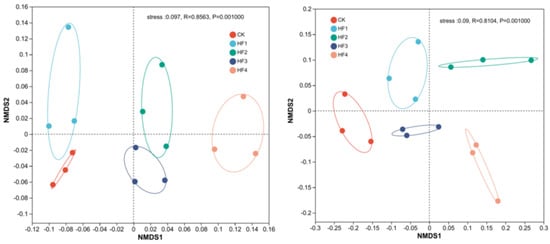 Beta diversity can characterize the species diversity and differences between habitats. To explore the differences in the community structure and diversity of soil bacteria and fungi at 120 days under different fertilization strategies among the samples, ANOSIM was used for inter-group difference tests based on Bray–Curtis distance and NMDS analysis was carried out. For the NMDS analysis of soil bacterial OTUs at 120 days (Figure 3, left), the order was sorted according to the Bray–Curtis distance between different treatments to reflect the sequential relationship between treatments. Among them, CK and HF1 were close in distance and HF2 and HF3 were close in distance, indicating that, at this time, the bacterial communities of CK and HF1 were similar and the bacterial communities of HF2 and HF3 were similar. However, the bacterial communities of CK, HF1, and HF4 were quite different. The stress value of this analysis was 0.097 (it is advisable for it to be less than 0.2), indicating that the analysis was reasonable. The stress value of the NMDS analysis of fungi at 120 days (Figure 3, right) was 0.09, showing that the sample had practical explanatory significance and representativeness for fungi and that the model was reasonable. Moreover, the sample points within the same group of each treatment were enriched, the sample repeatability was strong, and the samples of different treatments were dispersed, indicating that different fertilization treatments had a significant impact on the changes in fungal community structure.