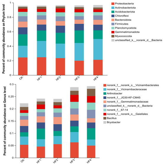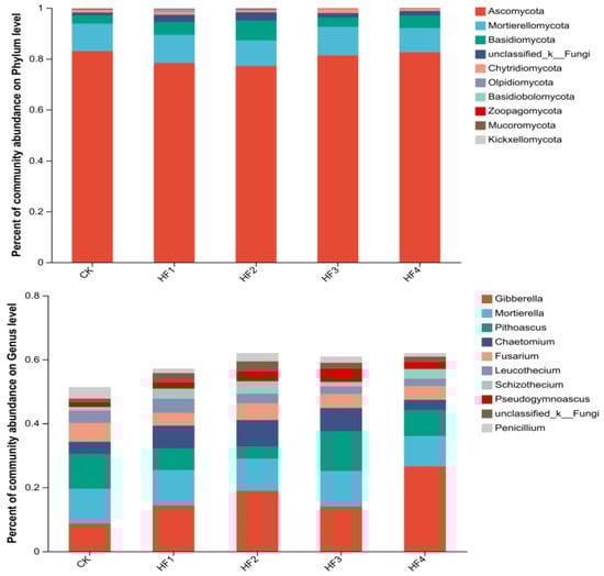 To deeply analyze the differential impacts of different fertilization strategies on the soil microbial community structure of potted corn, species composition analyses of soil bacteria and fungi for each treatment were conducted at the phylum level and genus level, and bar charts are used for display (Figure 4 and Figure 5). In terms of bacteria, the dominant phyla included Proteobacteria, Actinobacteria, etc. The sum of the relative abundances of the top five bacterial phyla accounted for between 73.39% and 76.64% of the total bacterial community of each treatment and the top ten bacterial phyla accounted for 95.76% to 96.72%. The application of biogas slurry led to a downward trend in the abundance of Proteobacteria. For example, HF3 decreased by 19.50% and 18.39%, respectively, compared with CK and HF1, while the abundance of Actinobacteria increased. HF4 increased by 77.38% and 27.56%, respectively, compared with CK and HF1. At the genus level, the relative abundances of the top ten bacterial genera accounted for 21.77% to 29.45% of the total bacterial community for each treatment. There were significant differences between Arthrobacter and Bacillus among treatments. HF2 and HF3 significantly reduced the abundance of Arthrobacter by 46.39% and 52.61% compared with HF1, and HF4 significantly increased the abundance of Bacillus by 139.27% compared with HF1.