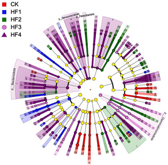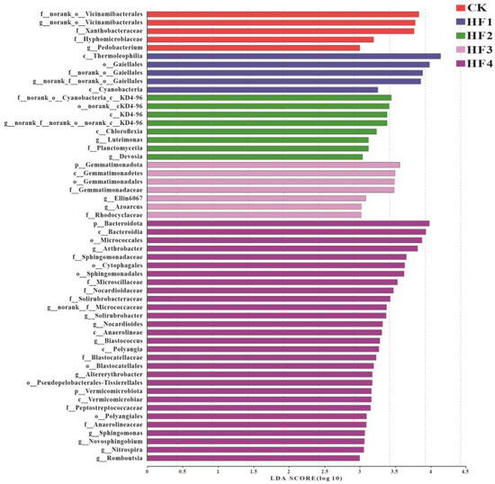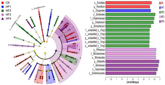 By means of LEfSe analysis, LDA > 3 and p < 0.05 were set as the differential screening threshold to obtain species with significant differences in relative abundance between groups. The relevant situation is shown in Figure 6 (above). In terms of bacteria, a total of 54 significantly different populations were identified. Among them, there were 5 in the CK treatment, 5 in the HF1 treatment, 8 in the HF2 treatment, 7 in the HF3 treatment, and 29 in the HF4 treatment. Regarding the main differential species (Figure 6, below), the main differential species in the CK treatment included Vicinamibacterales, Xanthobacteraceae, Hyphomicrobiaceae, and Pedomicrobium; the main differential species in the HF1 treatment were Gaiellales and Cyanobacteriia; the main differential species in the HF2 treatment were KD4-96, Clostridia, Luteimonas, Planococcaceae, and Devosia; the main differential species in the HF3 treatment were Gemmatimonadota, Ellin6067, Azoarcus, and Rhodocyclaceae; the main differential species in the HF4 treatment included Bacteroidota, Bacteroidia, Micrococcales, Arthrobacter, Sphingomonadaceae, Cytophagales, Nocardioidaceae, Solirubrobacteraceae, Anaerolineae, Blastococcus, Polyangia, Blastocatellaceae, Altererythrobacter, Peptostreptococcales-Tissierellales, Verrucomicrobiota, Peptostreptococcaceae, Novosphingobium, Nitrosospira, and Romboutsia. In addition, when LDA > 4 and p < 0.05 were used as the differential screening threshold in LEfSe analysis, species with significant differences in relative abundance between groups were also obtained, as shown in Figure 7 (left). In terms of fungi, a total of 19 significantly different populations were identified. Among them, there were two in the CK treatment, one in the HF1 treatment, nine in the HF2 treatment, three in the HF3 treatment, and four in the HF4 treatment. For the main differential species (Figure 7, right), the main differential species in the CK treatment were Eurotiales and Penicillium; the main differential species in the HF1 treatment was Onygenales; the main differential species in the HF2 treatment were Sordariales, Chaetomiaceae, Chaetomium, and Schizothecium; the main differential species in the HF3 treatment were Pithoascus, Microascaceae, and Microascales; the main differential species in the HF4 treatment included Gibberella, Nectriaceae, Hypocreales, and Sordariomycetes.