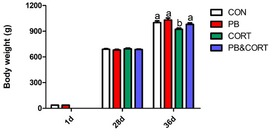At 28 days of age, there was no significant difference in body weight between the CON and PB groups (p > 0.05; Figure 1). Compared to CON, CORT administration markedly decreased body weight (p < 0.01; Figure 1); however, chickens in the CORT&PB group showed higher body weight than those in the CORT group at 36 days of age (p < 0.05; Figure 1).