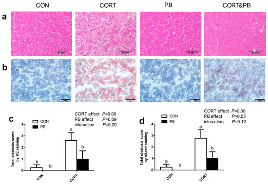 Hepatic histological sections stained with hematoxylin-eosin (HE) and Oil Red O showed that severe hepatic lipid accumulation was obviously observed in the CORT group; however, only slight vacuolar steatosis was shown in the CORT&PB group (Figure 2a,b). As shown in Figure 2c,d, CORT injection significantly increased the total steatosis score estimated by the HE stains and Oil Red O staining (p < 0.05), yet PB treatment tended to decrease it (p = 0.09).