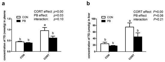 As shown in Figure 3, CORT treatment significantly increased the TG concentration in plasma and the liver compared to the control group (p < 0.01), and PB administration significantly decreased plasma TG concentration (p < 0.05) and tended to reduce the hepatic TG level (p = 0.06). The CORT&PB group showed lower levels of TG in plasma and the liver when compared to the CORT group (p < 0.05).