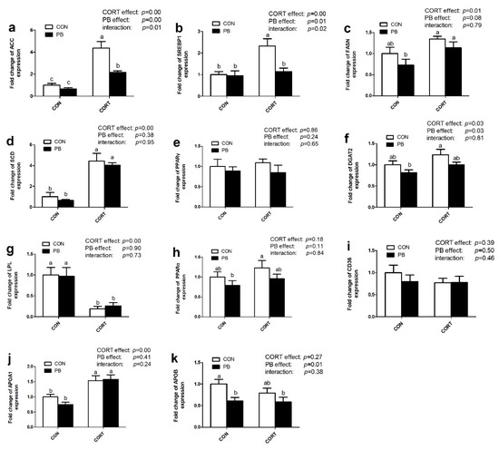 Effect of probiotic and CORT on liver expression of genes related to lipogenesis. (a), Hepatic ACC mRNA expression; (b), Hepatic SREBP1 mRNA expression; (c), Hepatic FASN mRNA expression; (d), Hepatic SCD mRNA expression; (e), Hepatic PPARα mRNA expression; (f), Hepatic DGAT2 mRNA expression; (g), Hepatic LPL mRNA expression; (h), Hepatic PPARα mRNA expression; (i), Hepatic CD36 mRNA expression; (j), Hepatic APOA1 mRNA expression; (k), Hepatic APOB mRNA expression; C-CON, control group; C-CORT, corticosterone-treated group; P-CON, PB-treated group; P-CORT, PB- and CORT-treated group. Data are expressed as means ± SEM (n = 8). Different small letter superscripts a–c indicates significant differences (p < 0.05).