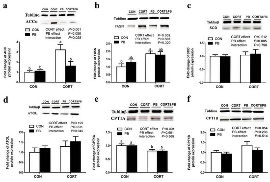 As shown in Figure 5, CORT treatment significantly decreased the protein expression of CPT1A in liver (p < 0.01) but significantly increased the protein expression level of CPT1B (p < 0.05). CORT and PB treatment had no significant effect on the expression of SCD and ATGL protein (p > 0.05). CORT treatment significantly increased the protein expressions of FASN and ACC in liver (p < 0.01), PB treatment had no significant effect on FASN, but tended to decrease the expression of ACC protein, and PB and CORT had a significant interaction effect on ACC protein expression (0.05 < p < 0.1).