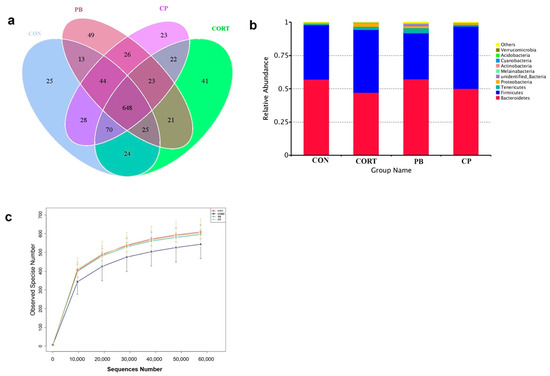 A total of 1,227,484 clean reads were obtained for the bacterial 16S rRNA genes by high-throughput sequencing analysis and 1082 OUTs were obtained by clustering at 97% identity. The number of common and unique OTUs among four groups was shown in the Venn diagram (Figure 6a), describing sample similarity and overlap intuitively. The PB group had the highest number of unique sequences (49 OTUs), followed by the CORT group (41 OTUs), the CON group (25 OTUs), and the CORT&PB group (23 OTUs) (Figure 6a). In addition, there were 648 OTUs (approximately 60% of total OTUs) shared among four groups (Figure 6a). A rarefaction curve was performed by the number of OTUs, and sequences randomly extracted from samples, directly reflecting the rationality of sequencing data. Figure 6c shows that as the depth of sequencing increases, the curve tends to be flat, indicating that the sequencing results were reasonable, and each sample can truly reflect the microbial composition.