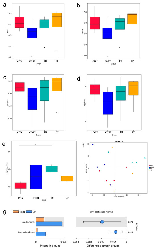 Alpha and Beta diversity analysis. The bacterial richness is estimated by ACE index (a) and Chao1 index (b); The bacterial diversity estimated by the Shannon index (c) and Simpson index (d). (e), Beta diversity based on weighted unifrac; (f), Principal Component Analysis (PCA); (g), Differences species analysis by t-test. CP, CORT- and PB-treated group n = 4.
