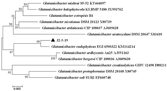 Neighbor-joining phylogenetic tree based on 16S rRNA gene sequences of strain J2-5-19 and representative Glutamicibacter species. Bootstrap values at each branch node indicate the percentage of support based on 1000 resampling replicates. Strain J2-5-19 clusters with G. endophyticus EGI 6500322T within the same clade. The scale bar represents 0.002 nucleotide substitutions per site.