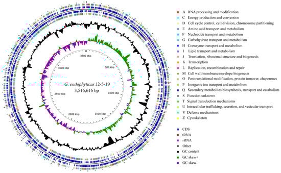Genomic circle map of G. endophyticus J2-5-19. From inside to outside, the first circle represents the scale, the second circle represents GC skew, the third circle represents GC content, the fourth and seventh circles represent the COG to which each coding sequence (CDS) belongs, and the fifth and sixth circles represent the location of CDS, transfer RNA, and ribosomal RNA on the genome.