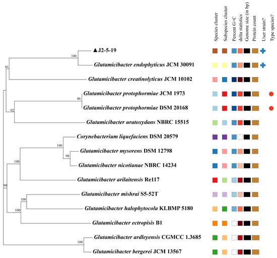 Sequence comparison of 16S rRNA genes revealed that strain J2-5-19 shared the highest sequence similarity (99.57%) to Glutamicibacter endophyticus based on the 16S rRNA gene. A phylogenetic tree was constructed using the 16S rRNA gene sequences of all species within the Glutamicibacter genus as references, employing the neighbor-joining method. Strain J2-5-19 clustered with the type strain Glutamicibacter endophyticus EGI 6500322T in the same clade (Figure 2), with a bootstrap value of 100%. This phylogenetic classification was further confirmed by a tree constructed using the maximum likelihood method (Figure S1). Therefore, the isolate was preliminarily identified as G. endophyticus J2-5-19.