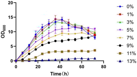 Seed cultures with an OD600 of 1.0 were prepared and inoculated into an LB liquid medium containing NaCl at concentrations ranging from 0 to 15% (inoculum size: 1%). The cultures were incubated at 37 °C and 180 rpm in a shaking incubator. Samples were collected every 6 h to monitor strain growth.