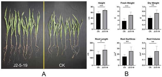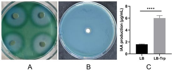 Strain J2-5-19 was inoculated into LB medium and LB medium supplemented with 5 mM tryptophan. The cultures were incubated at 28 °C and 180 rpm in a shaking incubator for 48 h. The fermentation broth concentration (OD600) was measured. After centrifugation, the cell-free supernatant was mixed with an equal volume of Salkowski reagent (1 mL of 0.5 M FeCl3 dissolved in 50 mL of 35% perchloric acid). After a 30-min reaction in the dark, the OD530 value was measured. The standard curve was used to calculate the IAA concentration in the cell-free supernatant [32]. The IAA unit yield in the fermentation broth was determined by calculating the ratio of the IAA concentration in the cell-free supernatant to the fermentation broth concentration (OD600).