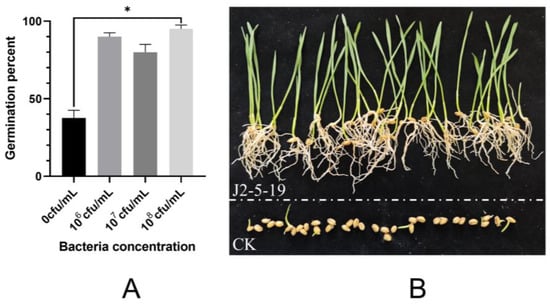 Salt stress conditions simulating coastal saline-alkali soil were created using sea salt (major components: NaCl 92%, Ca2+ 0.32%, Mg2+ 0.22%). Fresh bacterial cells were collected from the LB medium by centrifugation to prepare suspensions at concentrations of 108, 107, and 106 cfu/mL. Wheat seeds (variety: Jimai 22) were soaked in these suspensions, while the control group seeds were treated with an equal volume of sterile water. The germination experiment under salt stress was conducted using quartz sand as the substrate, which was saturated with a 4‰ sea salt solution. The seeds were cultured at 25 °C for 7 days with 16 h of light and 8 h of darkness per day. Every day, a 4‰ sea salt solution was sprayed onto the substrate to maintain its maximum water-holding capacity, ensuring a constant salinity level throughout the cultivation process. Three replicates were set for each treatment.