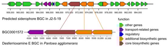 Genes encoding protein sequences were compared against the eggNOG (COG), NCBI NR, and UniProtKB Swiss-Prot databases using DIAMOND blastp (v2.0.11), with an E-value threshold of 1e-6.The best-hit COG identifier was assigned to each corresponding gene and visualized on a genomic circular map using different colors to represent their classifications. Secondary metabolite biosynthetic gene clusters in strain J2-5-19 were predicted using the antiSMASH 7.0 server (https://antismash.secondarymetabolites.org/) (accessed on 11 November 2024). Protein structure prediction was carried out using AlphaFold2 (v2.3.2), and the predicted structure was visualized using PyMOL (open source v3.0.0).