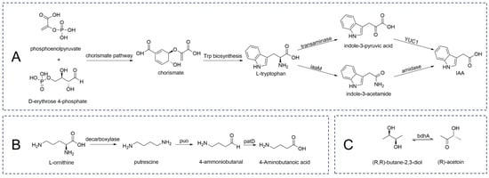 (A) IAA biosynthesis pathway involving tryptophan and its intermediates; (B) GABA biosynthesis from L-ornithine through putrescine and related intermediates; (C) Conversion of acetoin to (R,R)-butane-2,3-diol.