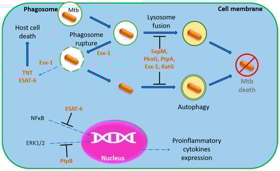 The primary pathogen strategy in the initial stages of the disease is the bacteria intracellular persistence and multiplication in infected cells, including professional phagocytes such as macrophages and dendritic cells [23]. For this purpose, the bacterium has evolved multiple adaptations to survive within host cells and subvert the host immune response (Figure 1). The main mechanisms include delayed phagosome maturation, phagosome rupture, suppression and subversion of host immune responses and the lytic death of host cells that facilitate pathogen dissemination.