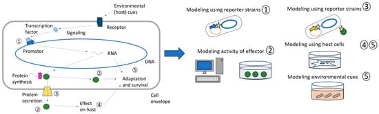 The majority of promising tuberculosis treatments were discovered by searching for compounds that would inhibit bacterial activity in vitro [8,9]. However, this approach is usually not applicable to virulence inhibitors, as these compounds do not affect viability directly. In order to compile a suitable compound library and select an optimal model system, it is necessary to have an understanding of which processes can be blocked by the compounds (Figure 2).