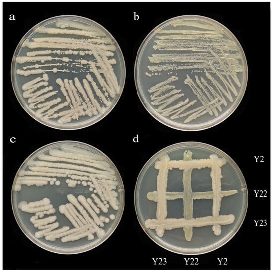 Characteristics of tested strains. (a–c) Strain morphology ((a) was Y2, (b) was Y22, and (c) was Y23). (d) Strain antagonism test. The agar plate confrontation method was employed to inoculate the selected target strains into a uniform LB solid culture medium. This was accomplished using a sterilized inoculation ring and a cross-shaped streaking technique. Subsequently, the plates were inverted and incubated at a constant temperature of 28 °C for a duration of 48 h. The interaction zone between the bacterial strains was examined to determine the presence of a transparent zone. The absence of such a zone suggested that the target strains could coexist, whereas the presence of a transparent zone indicated an antagonistic interaction between the strains, precluding their coexistence.