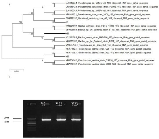 The DNA of the three strains was extracted, and PCR amplification was performed using 27F and 1492R universal primers to obtain three fragments with sizes of 1441 bp for Y2, 1405 bp for Y22, and 1464 bp for Y23, as shown in (Figure 2a). PCR products were obtained after the purification of each strain. Subsequently, DNA sequencing was carried out using the ABI3730-XL sequencing instrument. Sequence comparison and analysis were conducted using the BLAST program on the NCBI website based on the sequencing results. A phylogenetic tree was constructed using the maximum likelihood method, as shown in Figure 2b. According to the identification results, strains Y2 and Y22 belong to the genus Pseudomonas, while strain Y23 belongs to the genus Bacillus.