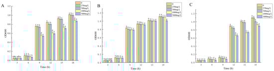 Growth of experimental strains under different lead concentration stress at different stress times. (A) Y2. (B) Y22. (C) Y23. LB medium: 10 g of sodium chloride; 5 g of yeast extract; 10 g of tryptone; 15 g of agar; pH 7.0–7.2; 1 L of deionized water; and 0, 250, 500, 1000, and 5000 mg/L of lead nitrate. Three biological replicates were conducted for each experiment. Different lowercase letters indicate significant differences at different lead treatment concentrations at the same time (p < 0.05).