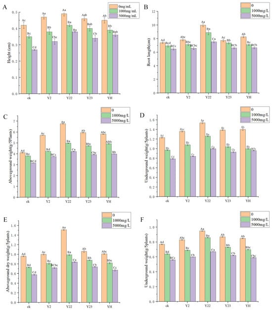 Effect of strains on alfalfa seedlings under lead stress. (A) Effects of strains on plant height of alfalfa under different concentrations of lead stress. (B) Effects of strains on root length of alfalfa under different concentrations of lead. (C) Effects of strains on fresh weight of alfalfa under different concentrations of lead. (D) Effects of strains on fresh weight of underground alfalfa under different concentrations of lead. (E) Effects of strains on dry weight of aboveground alfalfa under different concentrations of lead stress. (F) Effects of strains on underground dry weight of alfalfa under different concentrations of lead stress. Three biological replicates were conducted for each experiment. Different capital letters indicate significant differences in the same treatment under different lead concentrations. Different lowercase letters indicate significant differences (p < 0.05) between different treatments at the same lead concentration.