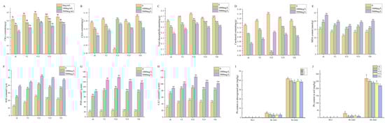 Effects of strains on chlorophyll and antioxidant properties of alfalfa seedlings under lead stress. (A) chlorophyll a, (B) chlorophyll b, (C) total chlorophyll, (D) carotenoids, (E) MDA, (F) SOD, (G) POD, and (H) CAT. (A–H) Different capital letters indicate significant differences in the same treatment under different lead concentrations. Different lowercase letters indicate significant differences (p < 0.05) between different treatments at the same lead concentration. (I) Lead content in ground parts under different Pb stress. (J) Lead content in underground parts under different Pb stress. Three biological replicates were conducted for each experiment. (I,J) Different lowercase letters indicate that under different concentrations of lead stress, the lead content in soil treated with different bacterial solutions is significantly reduced compared to CK (p < 0.05).