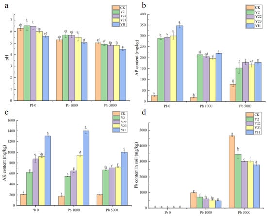 Contents of (a) pH, (b) AP, (c) AK, and (d) Pb in rhizosphere soil samples of alfalfa under different treatments. Different lowercase letters indicate significant differences in the properties of soil treated with different bacterial solutions under different lead stress concentrations compared to CK (p < 0.05).
