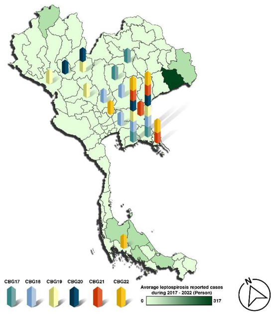 Surveillance locations of CBG training sites (2017–2022) in Thailand and reported passive surveillance leptospirosis cases from the Thai MoPH. Surveillance sites for each year are represented by the code “CBG” and distinguished by color.